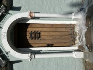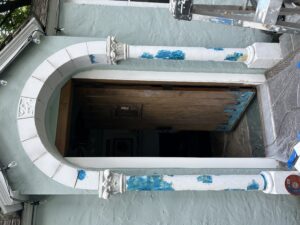 The restoration extended beyond the woodwork to the classical masonry elements that define the building’s character. The stone archway and its flanking Corinthian columns were carefully stripped of failing paint and repaired to reveal their original crisp lines. To highlight the exquisite detail of the period architecture, a sophisticated color palette was applied, featuring hand-painted gold accents on the ornate capitals and the central keystone of the arch. This careful application of color brings a refined elegance to the small structure, making it a standout feature of the property.