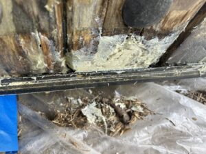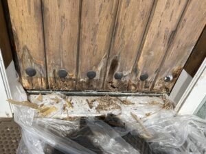 This view highlights the extensive loss of original wood at the bottom of the door, requiring a master’s touch to reconstruct the profile.