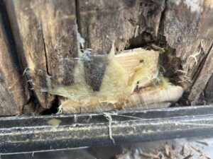 A technical close-up of the epoxy consolidation process, where high-strength resins are used to stabilize and rebuild the rotted wood fibers.