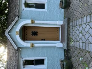 Located in the historic Forest Hill section of Newark, New Jersey, this project involved the meticulous preservation of a unique one-room outbuilding (“the Dollhouse”). Despite its smaller scale, the structure features high-classical architectural details that had suffered significant deterioration from decades of exposure. The primary challenge was the severe wood rot along the base of the solid plank door, where moisture “wicking” had compromised the structural integrity of the timber. Rather than replacing these historic materials, our master craftsman utilized advanced epoxy consolidation and wood-fill techniques to stabilize the core and rebuild the lost profiles, ensuring the door remains weather-tight for decades to come.