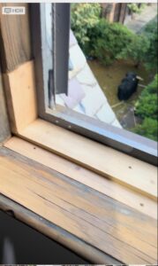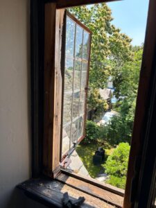 Midway point of restoration with replaced and repaired window sills and jams before final painting and staining