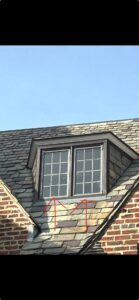 The finished slate-clad shed dormer showcasing the completed restoration work.  Revealing completely restored window sills, side jambs, trim, and properly integrated flashing systems. The dormer now sits cleanly within the third-floor slate roofline, with all wood components rebuilt to match original profiles and the critical pan flashing and step flashing correctly installed to prevent future water infiltration. The restoration preserves the historic character of this early 20th-century Colonial mansion while ensuring structural integrity for generations to come.
