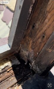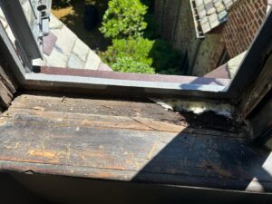 Close-up documentation of the extensive decay found at the lower corner of the window jamb and sill. Black rot and complete structural failure show decades of water infiltration—the inevitable result of failed flashing and deferred maintenance on these high-elevation dormers.
