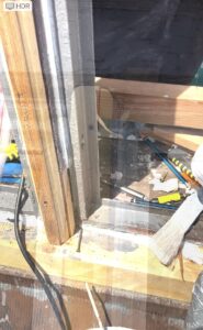 Fresh lumber replacement in progress, showing new sill and jamb components being fitted into the dormer opening. The yellow protective membrane and exposed framing reveal the extent of structural repair required after removing decades of rotted material.