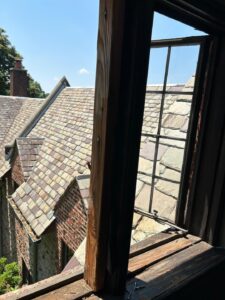 Interior perspective looking down through the restored window opening toward the slate roof below, showing the dramatic height and challenging working conditions of this third-floor dormer restoration. The dark wood jambs frame the view, emphasizing the precision required when working at this elevation on a historic slate-roofed mansion.