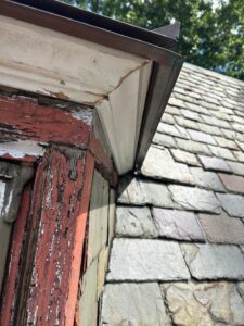 Close-up of the dormer’s exterior corner trim and slate integration, showing peeling paint, exposed bare wood, and rot at critical junctions. The failed paint and flashing allowed water to penetrate behind the slate cladding, accelerating the decay of all wood components.